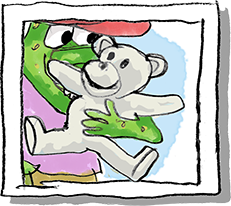 “I am Raymond’s best friend and Raymond is my best friend. But we don’t always agree. For example, he loves the beach. I do not. That’s because I am a polar bear. Polar bears do not like hot sunny places like beaches. At the beach it’s easy to get sand in your ears. Also, other surprising, unexpected things can happen. I usually do not like surprises, like falling down or getting lost. But I do like surprise hugs from Raymond.”